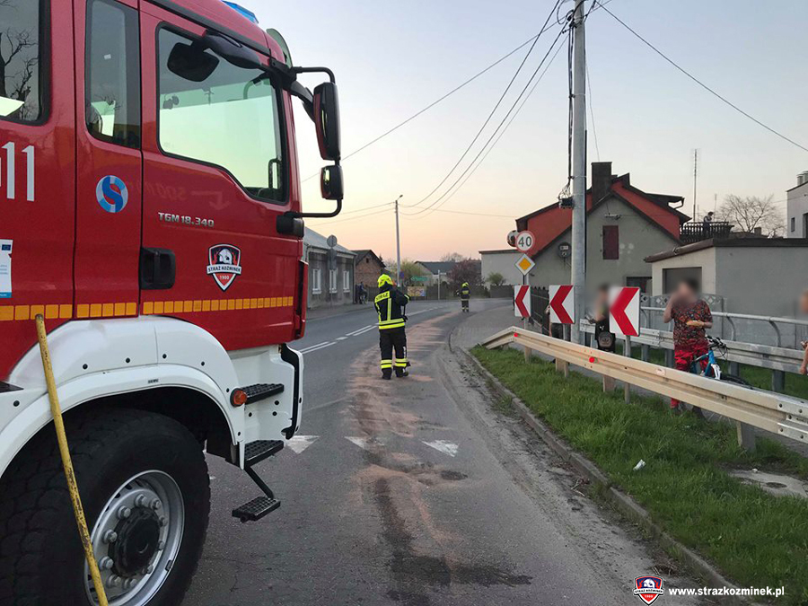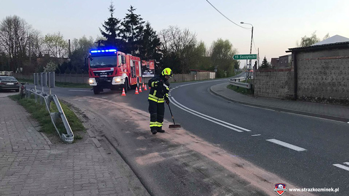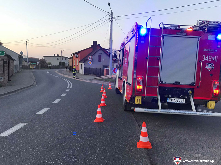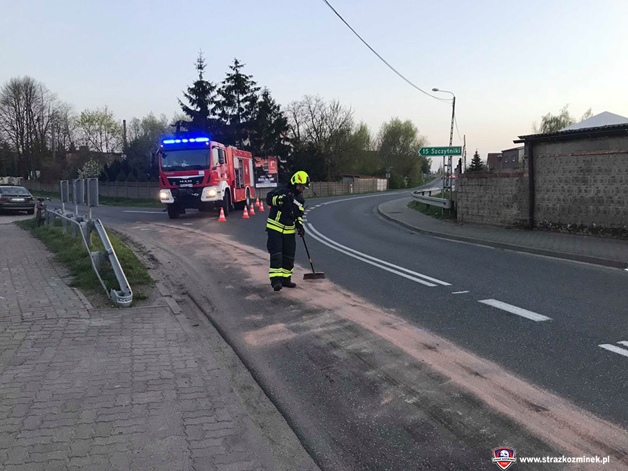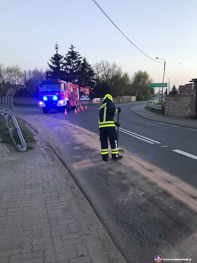 Dnia 18 kwietnia po godz. 19:30 dwa zastępy OSP Koźminek zostały zadysponowane do usunięcia plamy oleju na ul. Kaliskiej. Plama ciągnęła się na odcinku o długości 450 metrów. Działania strażaków polegały na posypaniu wydobytego na jezdnię płynu eksploatacyjnego sorbentem.