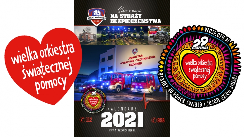 Druhowie z OSP Koźminek po raz kolejny pragną się włączyć w zbiórkę funduszy na rzecz Wielkiej Orkiestry Świątecznej Pomocy. Od kilku lat wraz z cyklistami z Kalisza dostarczaliśmy zebrane przez nas środki do siedziby WOŚP w Warszawie. Ten rok jest jednak inny i dlatego na aukcje już teraz przekazujemy nasz 13-stronicowy kalendarz na rok 2021. Ten egzemplarz jest specjalny, ponieważ jako jedyna sztuka ma na okładce logo WOŚP. Na jego stronach znajdują się zdjęcia z akcji i ćwiczeń, w jakich uczestniczyliśmy w 2020 roku. Mamy nadzieję, że trafi to prawdziwego pasjonata, a jednocześnie przyczyni się do wsparcia charytatywnej działalności Wielkiej Orkiestry Świątecznej Pomocy.